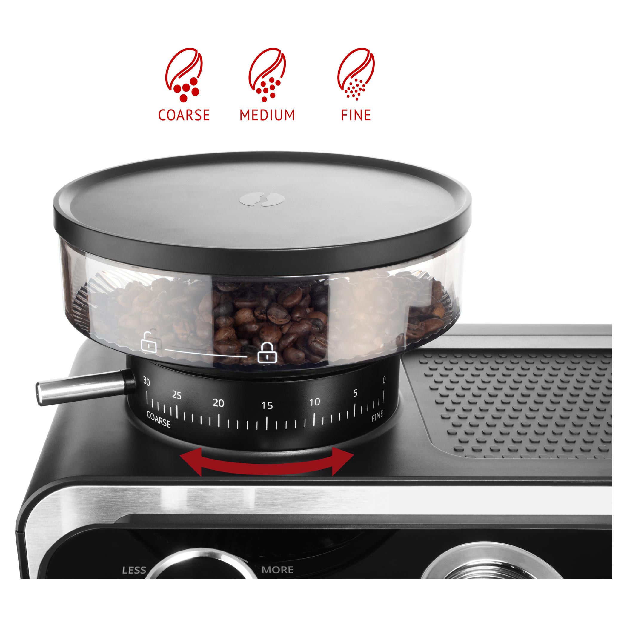 A kávébab az alap. A kávéfőzőbe épített daráló lehetővé teszi a friss őrlést közvetlenül a szűrőtartóba. A 30 őrlési fokozatnak köszönhetően megtalálhatja az ideális beállítást espressohoz és lungohoz is.